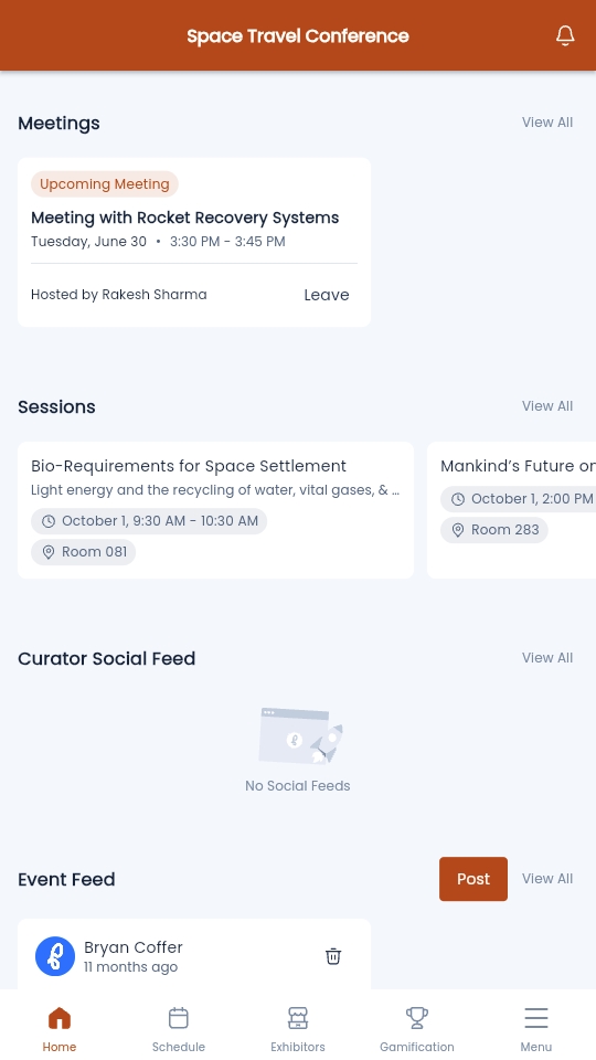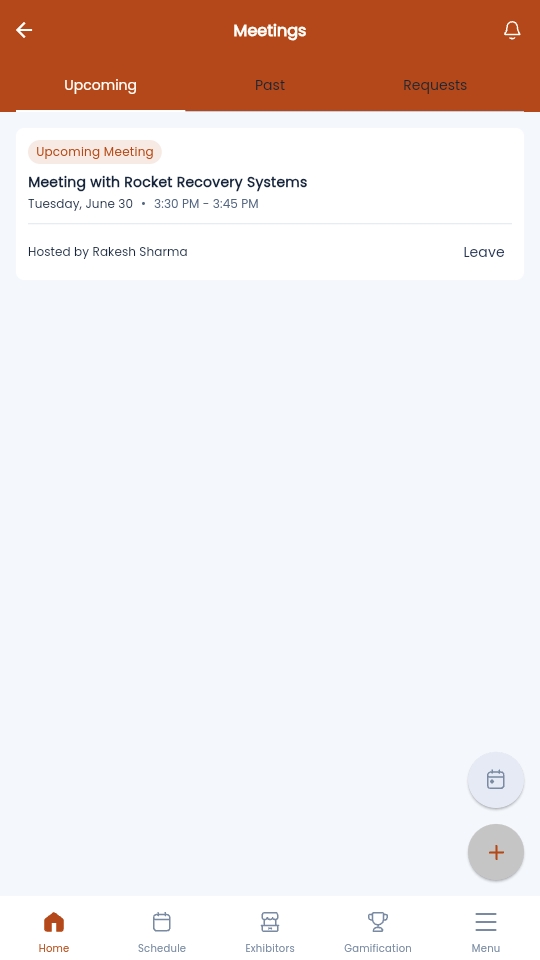 If enabled by the Event Administrator, meeting requests and scheduled meetings will appear on the event home page. Please note that this feature will not be available if it has not been configured.