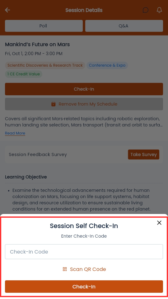 It depends; your Event Organizers determine the option to check yourself into a session. If the Event Organizer has allowed self check- ins, all you need to do is open your session on the Event App and select Check In. You will then have the option to scan the self check-in QR code or enter a case-sensitive text code (if enabled) to check yourself into the session.